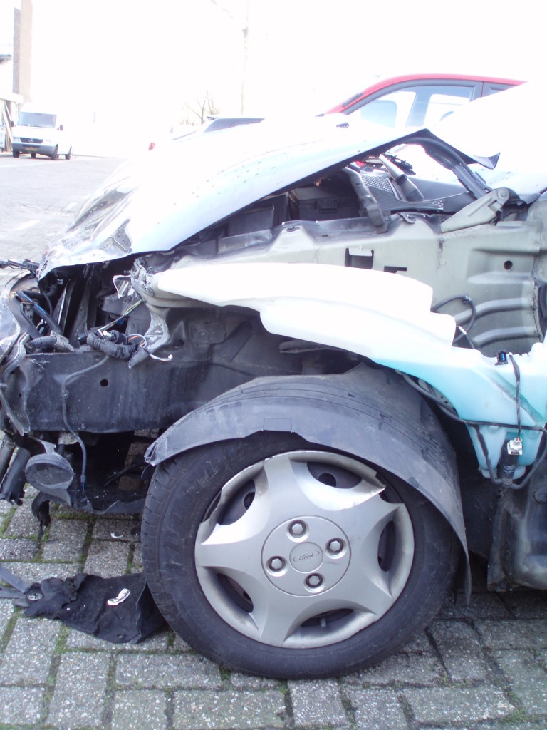 Tis maar goed dat de auto er zo uitziet, anders had ik dat gehad. Ik had alleen twee brandwonden aan de muizen van mijn handen als gevolg van een airback die met een noodgang langs mijn handen schampte. Geloof me je kan beter je handen in de kwart voor drie stand houden tegenwoordig met de airbacks. Bij tien voor twee zoals geleerd met auto rijles vroeger brand je dus je jatten.